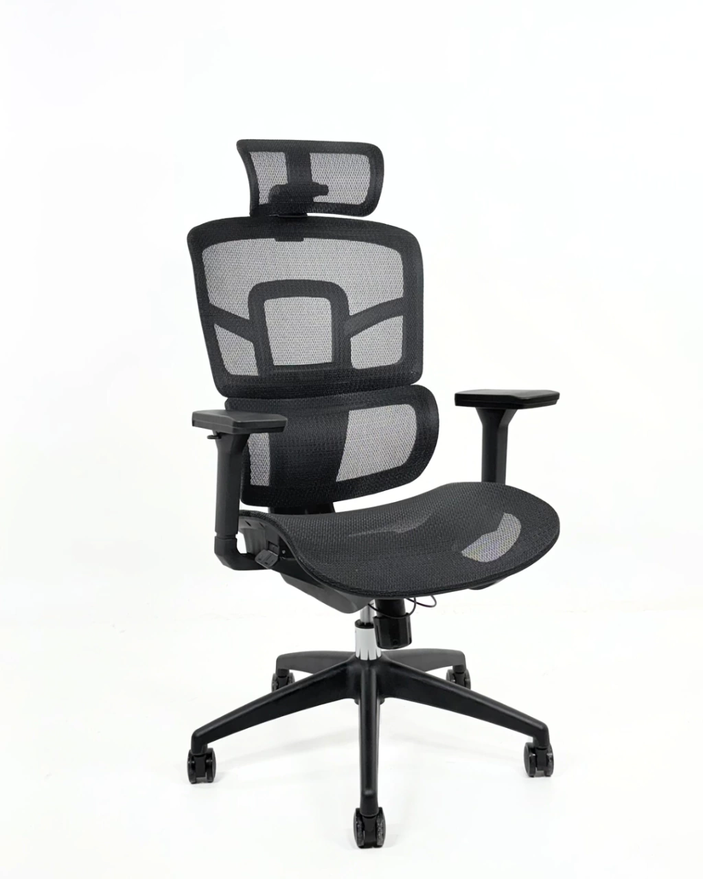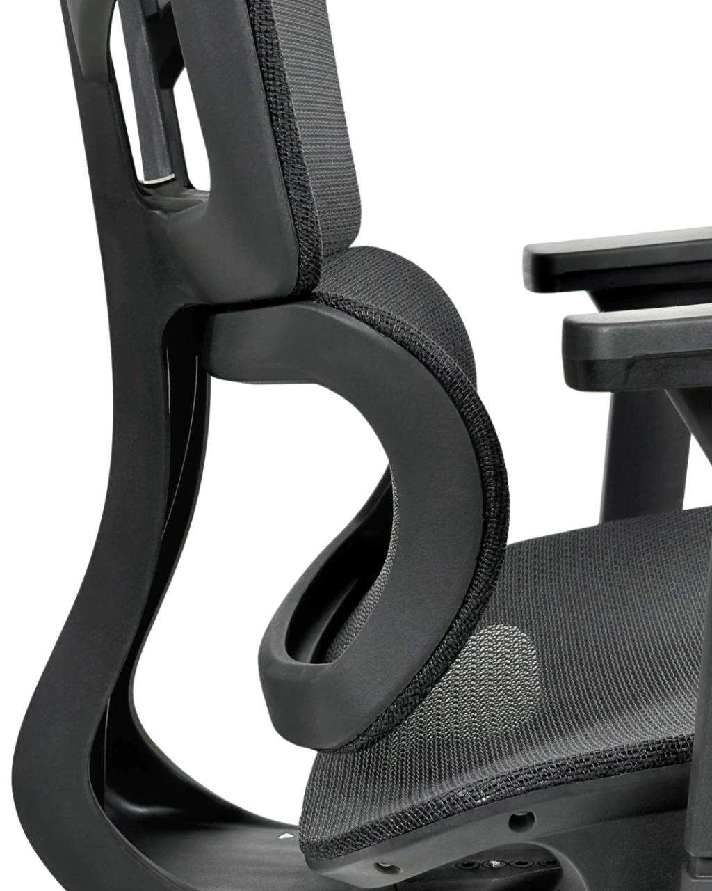 Encosto em tela bipartido com apoio lombar com ajuste automático de tensão.
